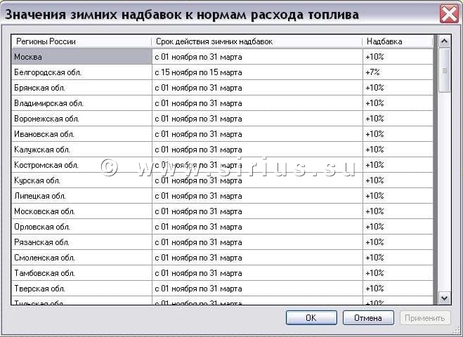 Значения зимних надбавок к нормам расхода топлива