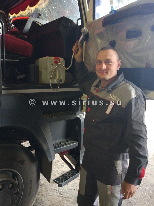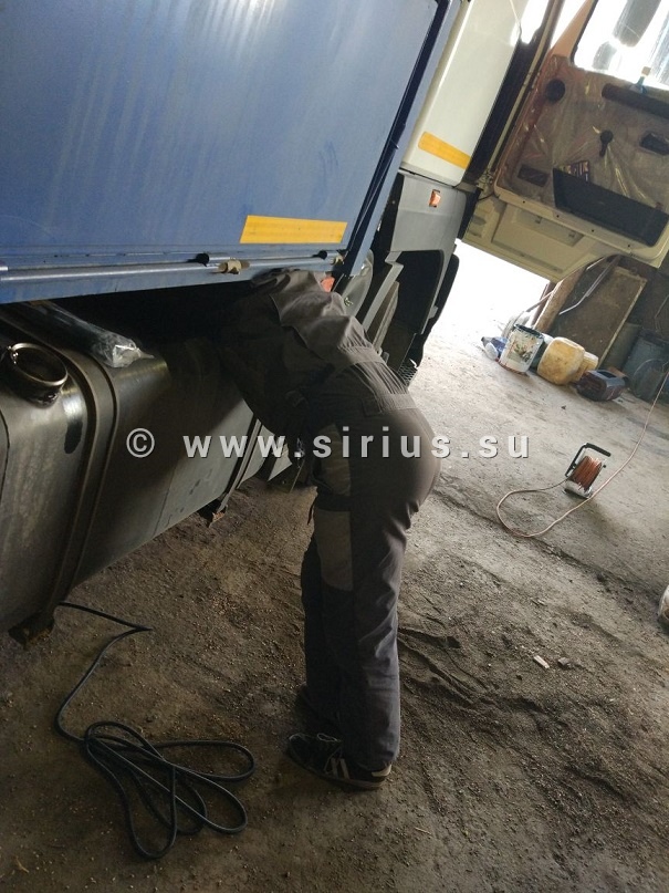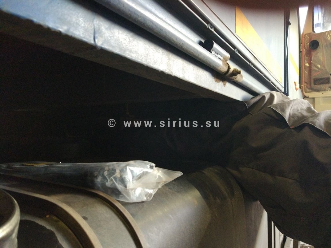 Обычно монтажники сверлят отверстие в баке с помощью коронки и дрели и ставят ДУТ так, чтобы он не мешал работе штатного оборудования. В данном случае это было нереально — дрель попросту не вмещалась в такое узкое расстояние. Так же был невозможен демонтаж бака на территории клиента. Что делать? Отказывать заказчику категорически неприемлемо для компании «Сириус Навигатор». Поэтому мы включили свою смекалку, природную сообразительность и нестандартность мышления. Заменили дрель на шуруповерт, взяли коронку поменьше. И выбрали самого худого монтажника, которого на всякий случай еще пару дней подержали без пирожков и бутербродов. Не без труда, но он все же втиснулся в эти 20 см между баком и кузовом и выполнил работу, доказав в очередной раз, что для компании «Сириус Навигатор» невыполнимых задач не бывает!